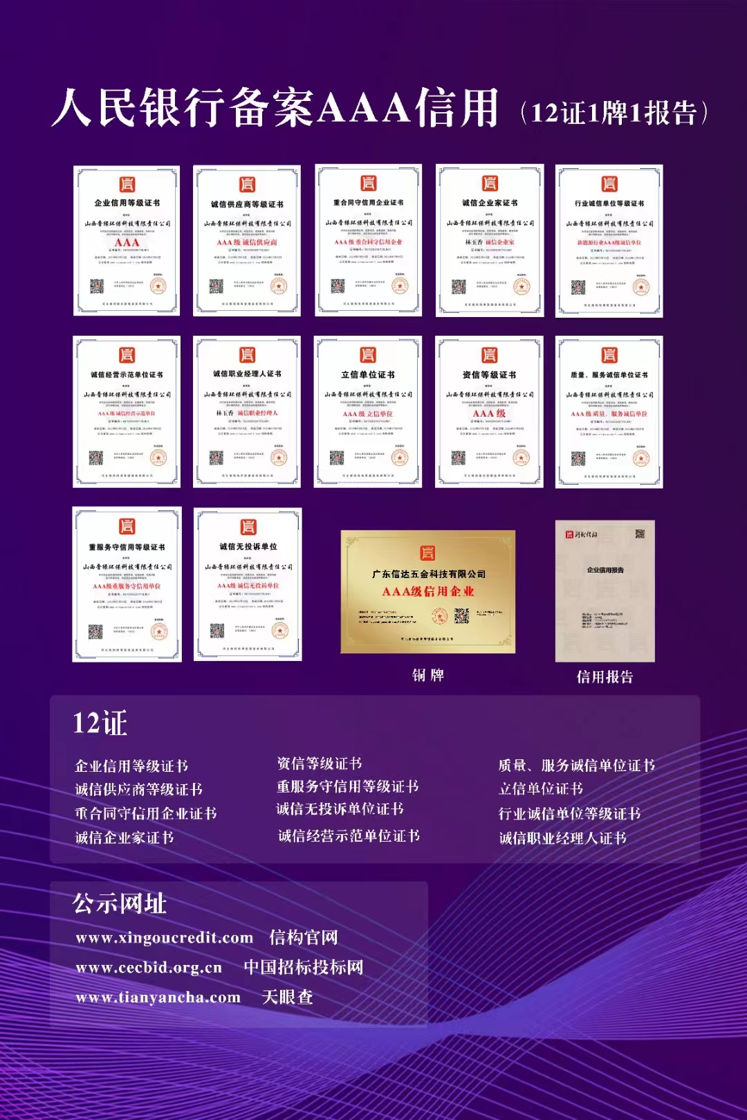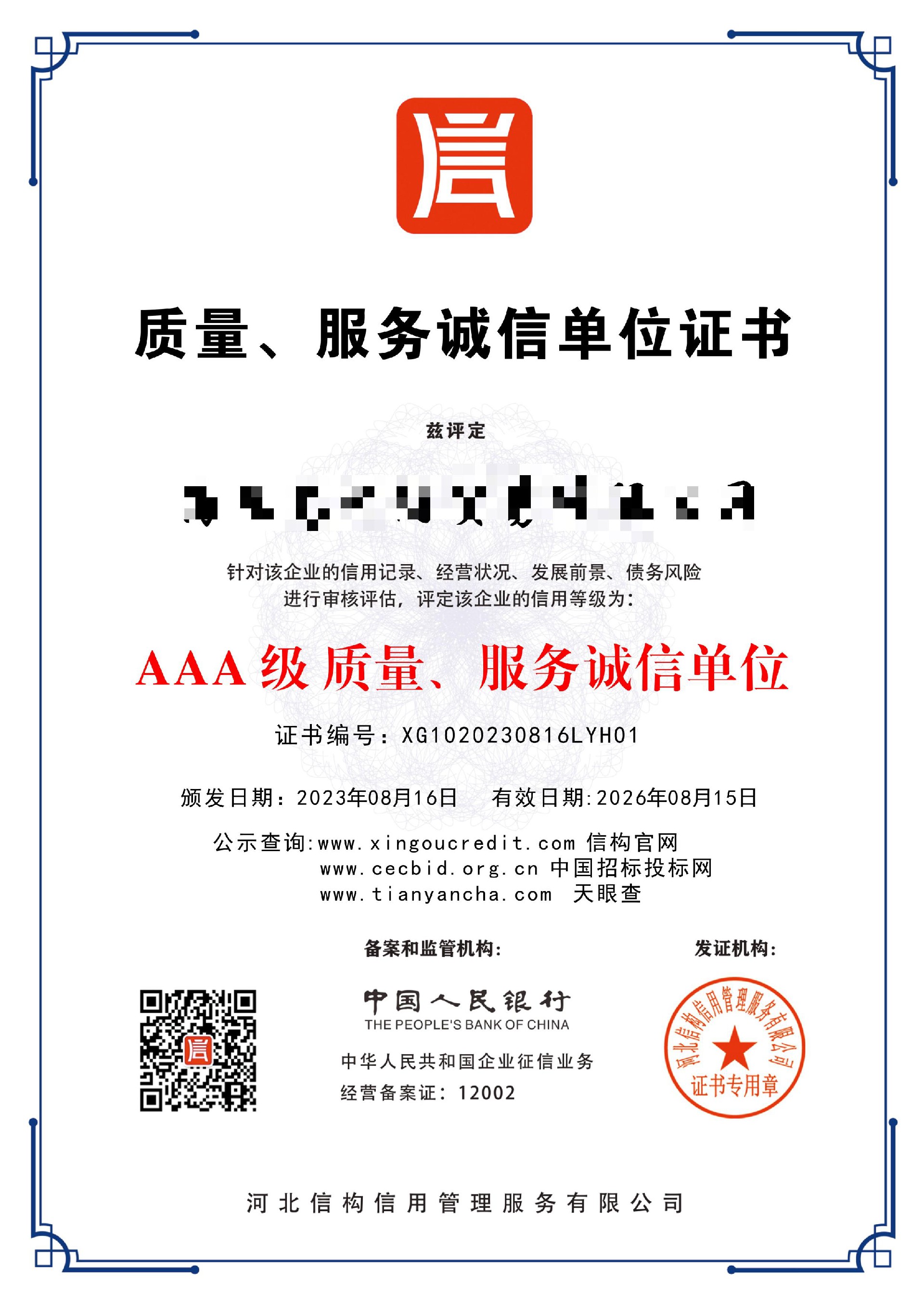 3A認證人民銀行備案的AAA級質量、服務誠信單位認證證書有效期三年。